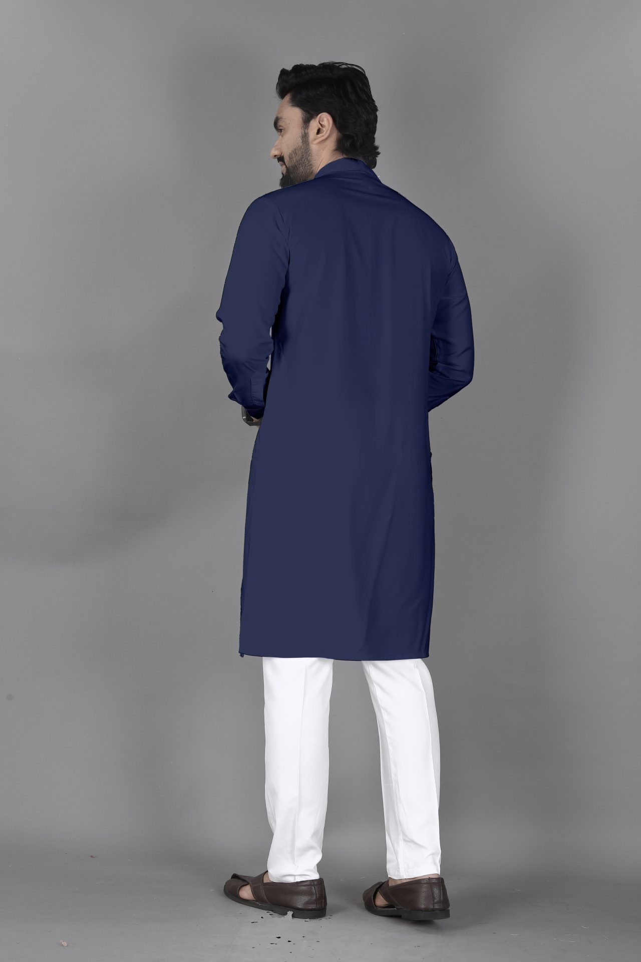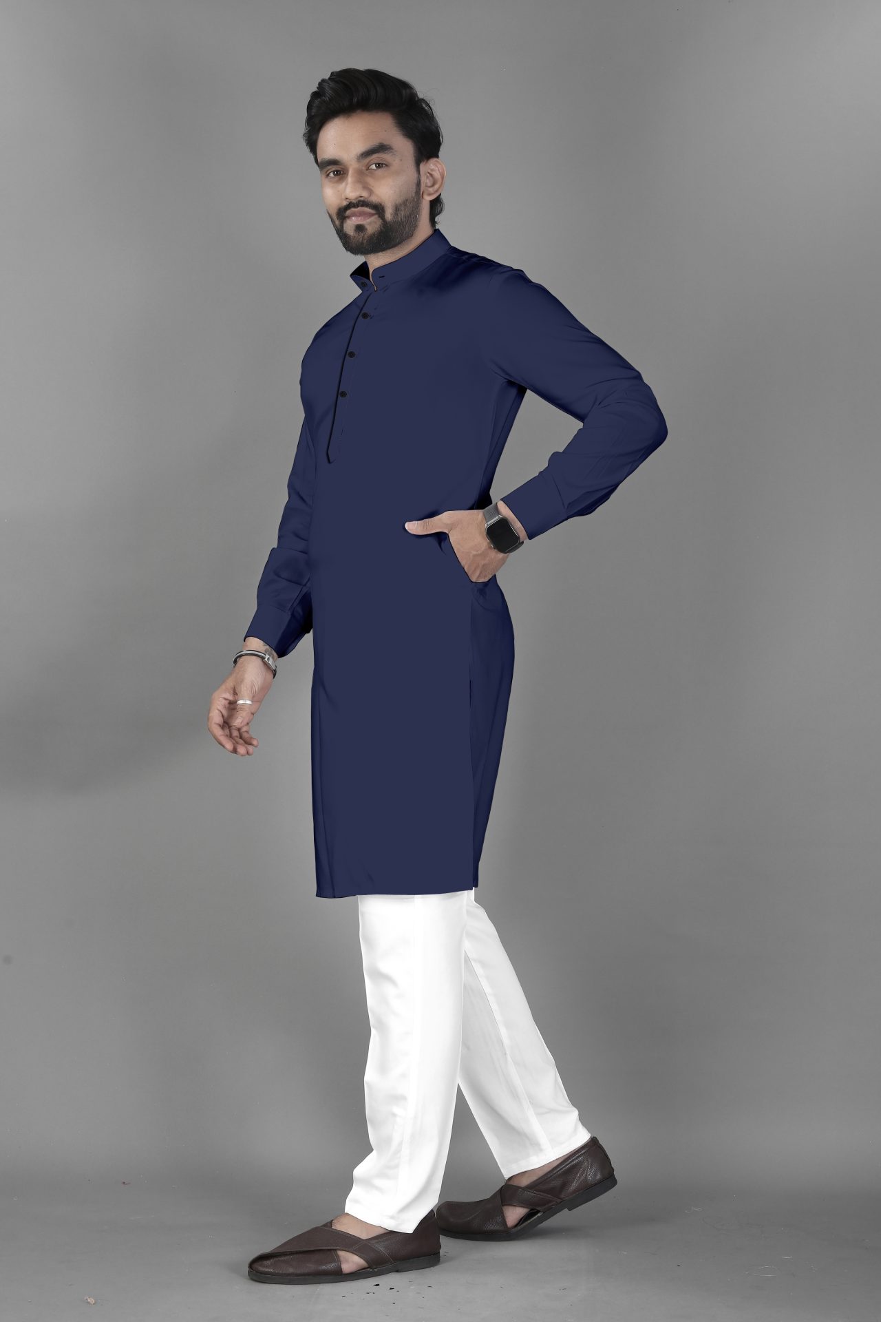 The ban collar holds a strong place in traditional menswear. It represents discipline, grace, and understated royalty. Meanwhile, blue symbolizes trust, harmony, and inner strength. Together, they create a look that feels culturally grounded and emotionally soothing. As a result, this outfit feels meaningful and timeless.