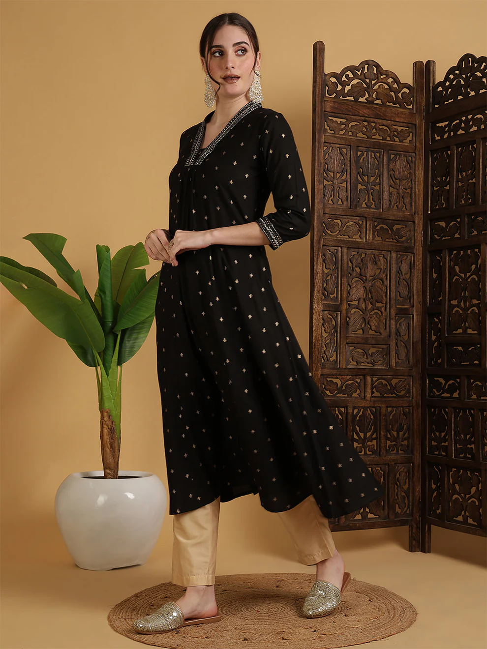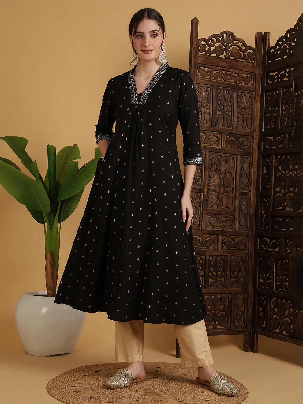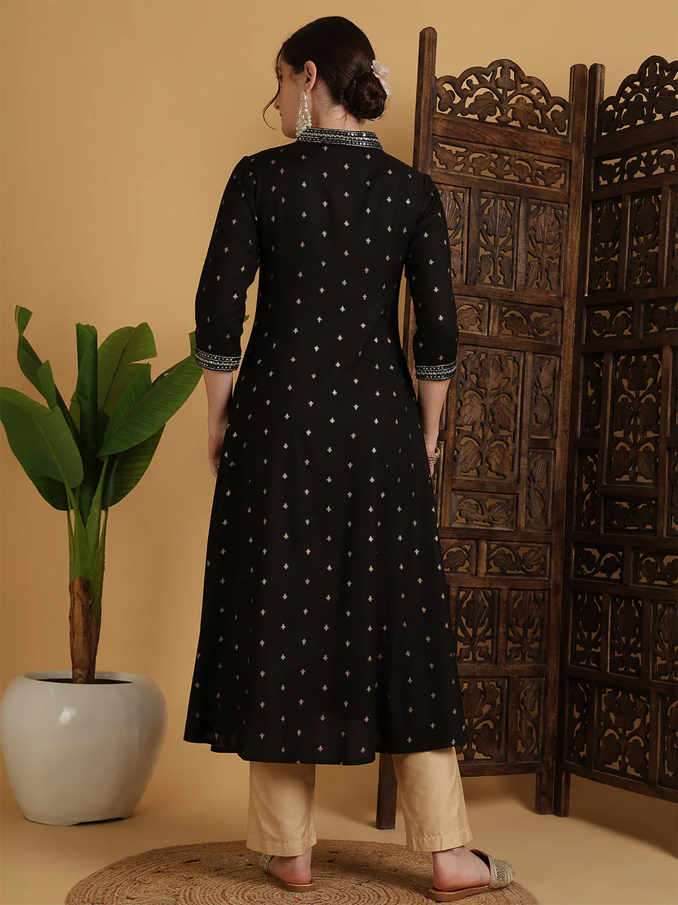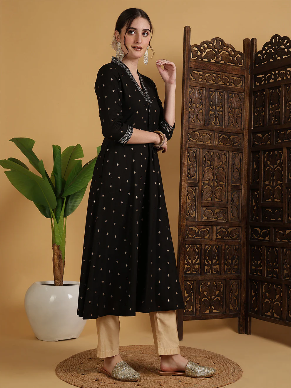 This black Anarkali kurti offers refined simplicity and comfort. The semi-flared shape enhances natural movement. Additionally, the solid pattern creates a clean and polished look. The calf-length cut ensures versatility for various occasions.