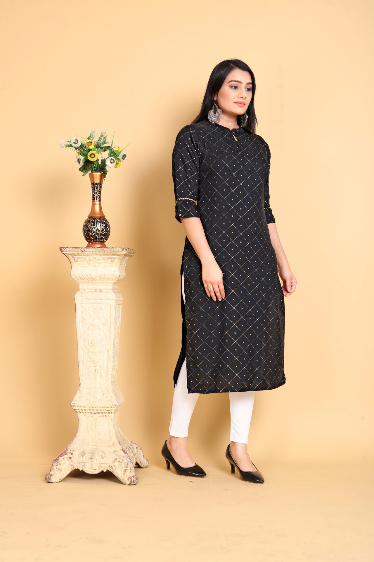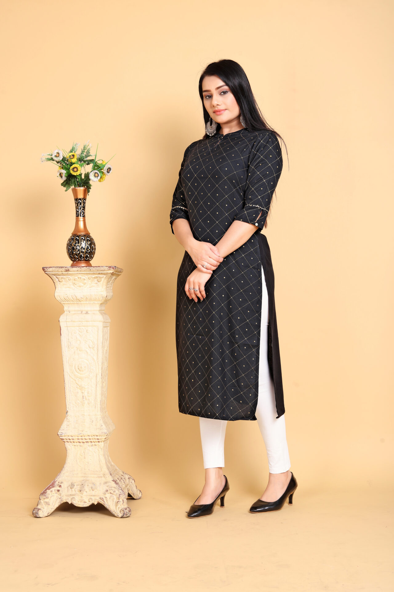 This Black Cotton Rayon Kurta is a timeless piece, designed for women who seek sophistication in simplicity. Its geometric print and comfortable fabric make it an essential addition to your wardrobe.Cultural Significance