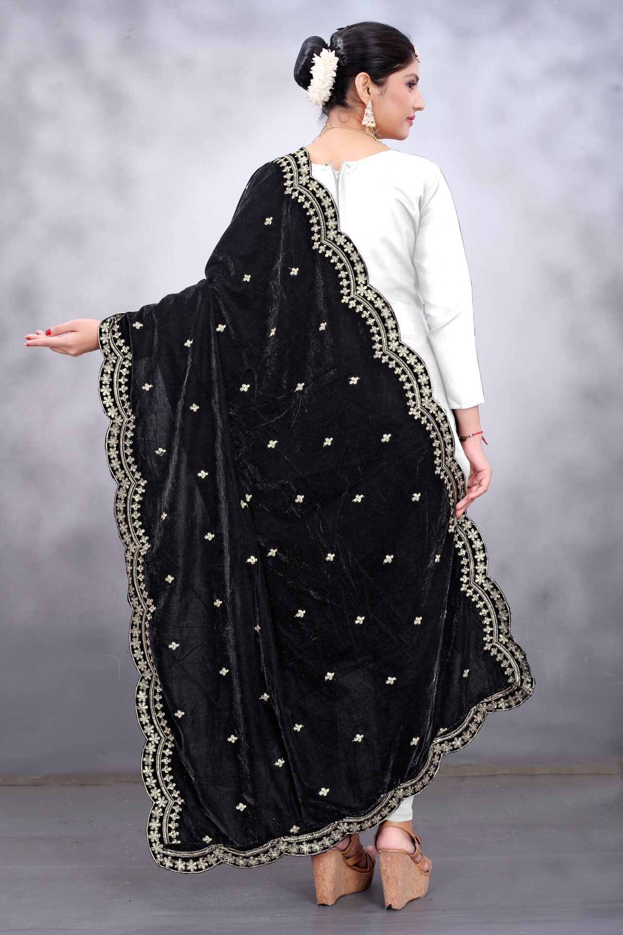 This black embroidered velvet stole is a fine example of craftsmanship and luxury. Here are the key product details: