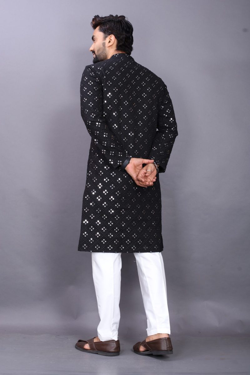 The Black Mirror Kurta Pajama has been a staple in Indian culture for generations. It signifies tradition, simplicity, and elegance. Mirror work embroidery adds vibrancy and a festive spirit, making this attire a favorite for cultural and celebratory events.