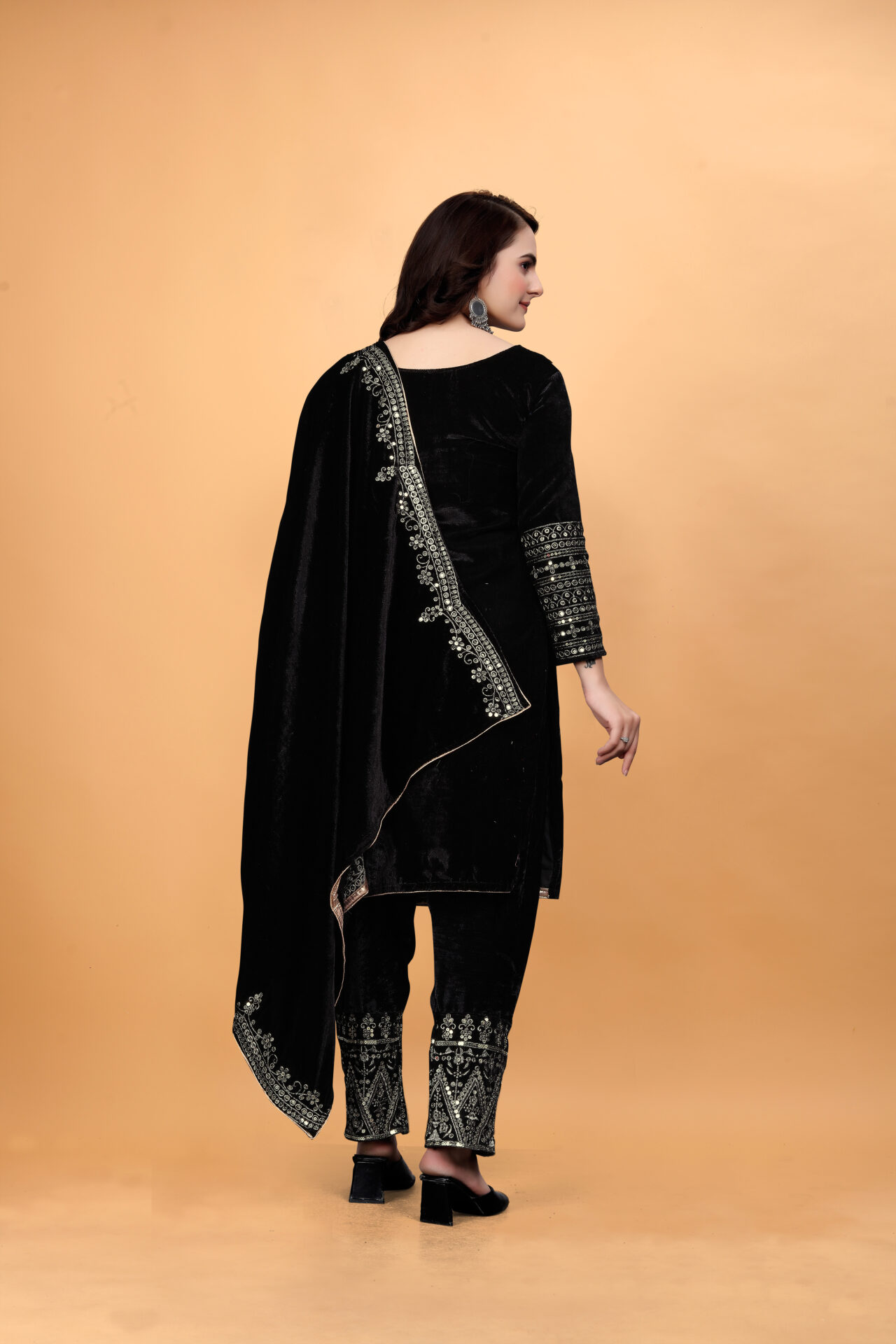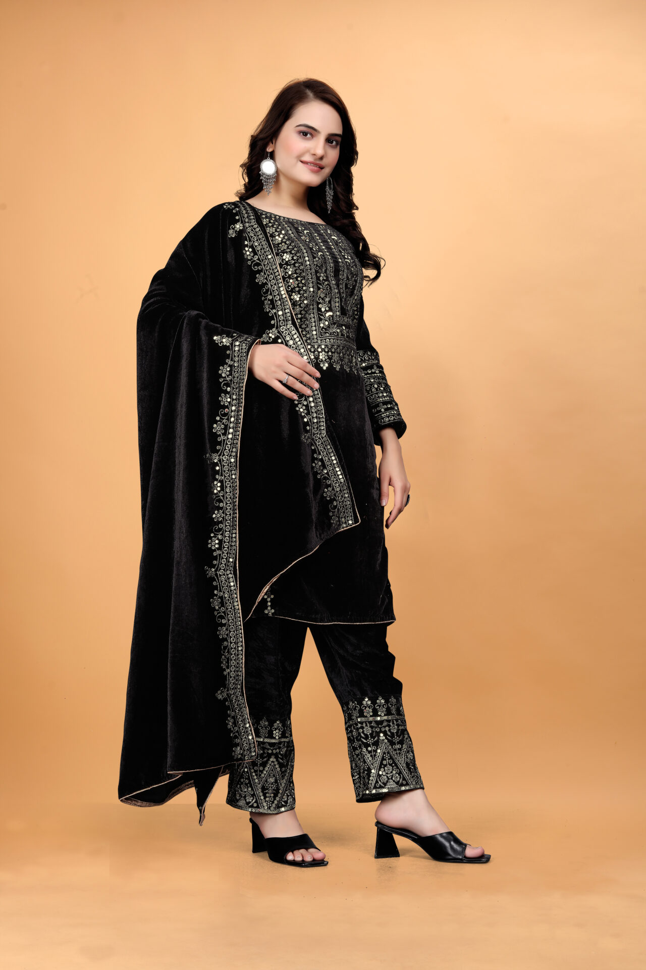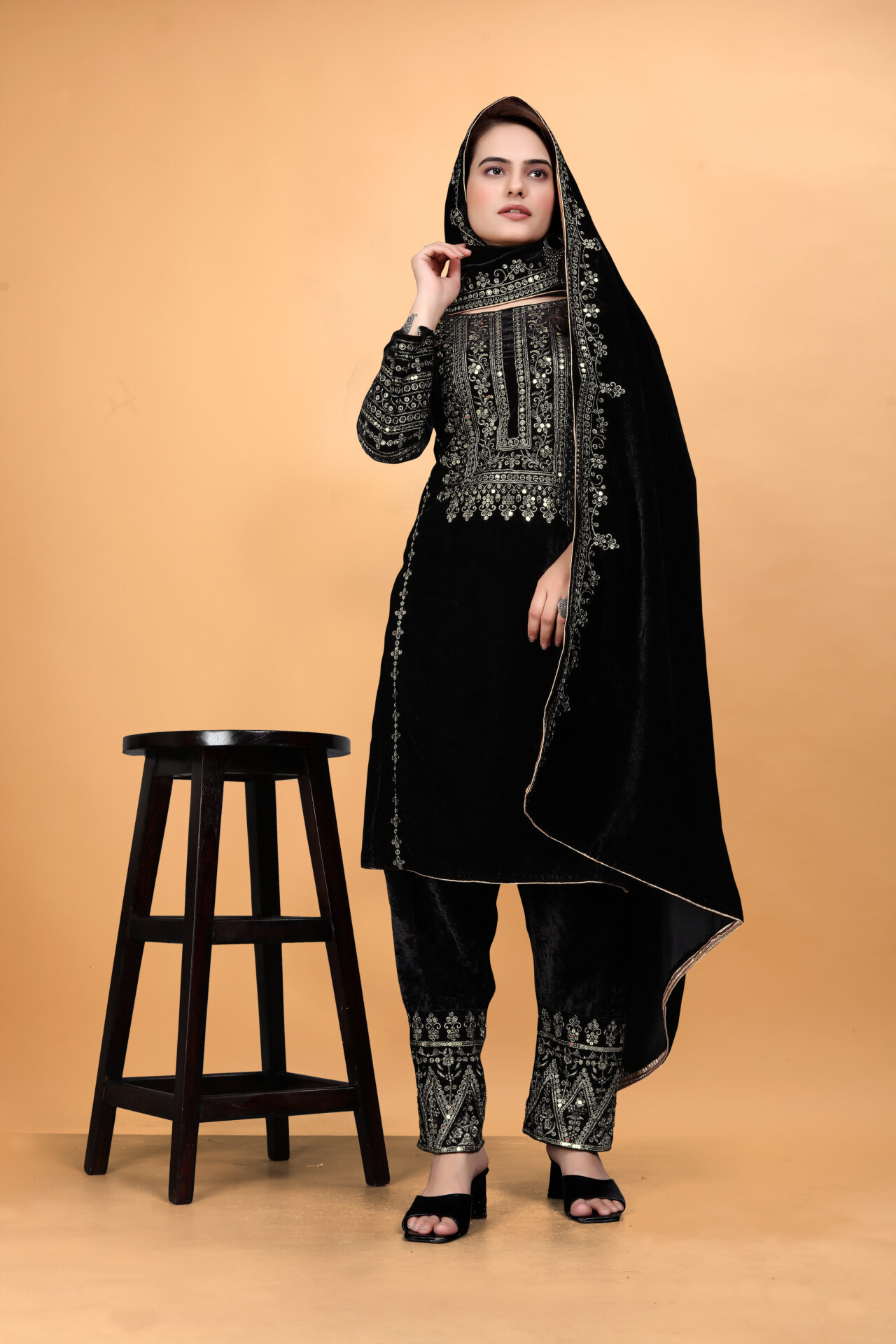 - Indulge in the regal allure of black velvet embroidered plazo suit and revel in the exquisite craftsmanship of the intricate embroidery, making every wear a truly indulgent experience.