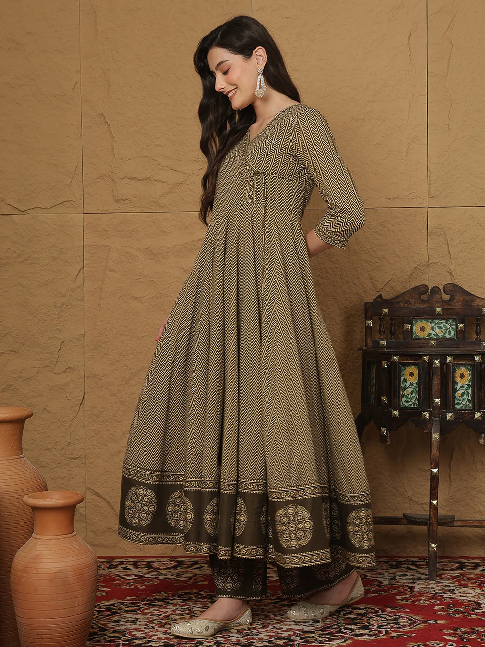 The Brown Cotton Anarkali Kurti Set reflects a classic charm rooted in India’s rich textile heritage. The Anarkali silhouette has been cherished for centuries due to its graceful flare and regal flow. Brown symbolizes stability and earthiness, making this attire both calming and sophisticated. This set blends traditional artistry with modern comfort, creating a timeless look for women who value culture and style.