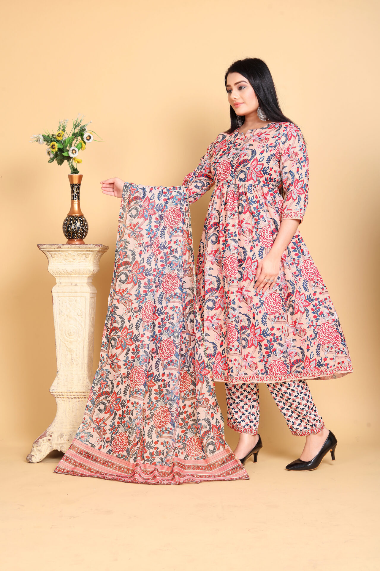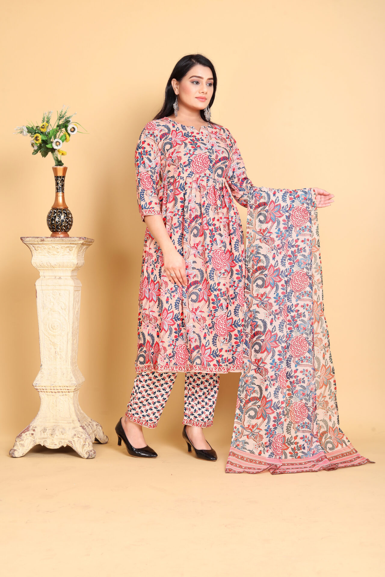 This kurta pant set reflects India’s rich heritage of floral prints and traditional craftsmanship. Its A-line silhouette and flared hem echo timeless styles while offering a contemporary appeal.Occasions to Wear the Cotton Printed Kurta Pant Set