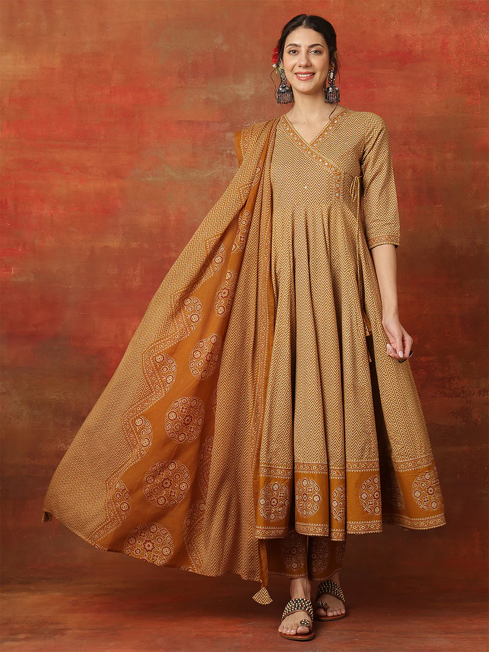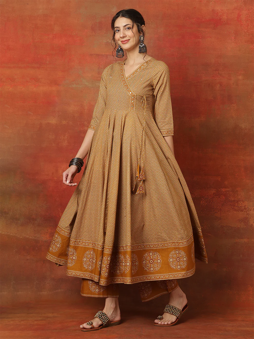 Light fabrics matter during hot weather. Fortunately, breathable cotton keeps you cool and relaxed. Moreover, the airy Anarkali cut promotes better airflow. Consequently, you stay comfortable during outdoor celebrations. Three-quarter sleeves also provide balanced coverage. Therefore, the outfit suits both casual and festive settings. Soft cotton textures feel gentle on the skin. As a result, you experience all-day comfort without compromising style.