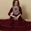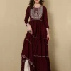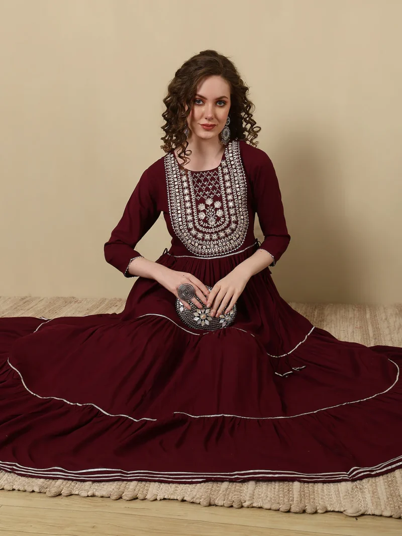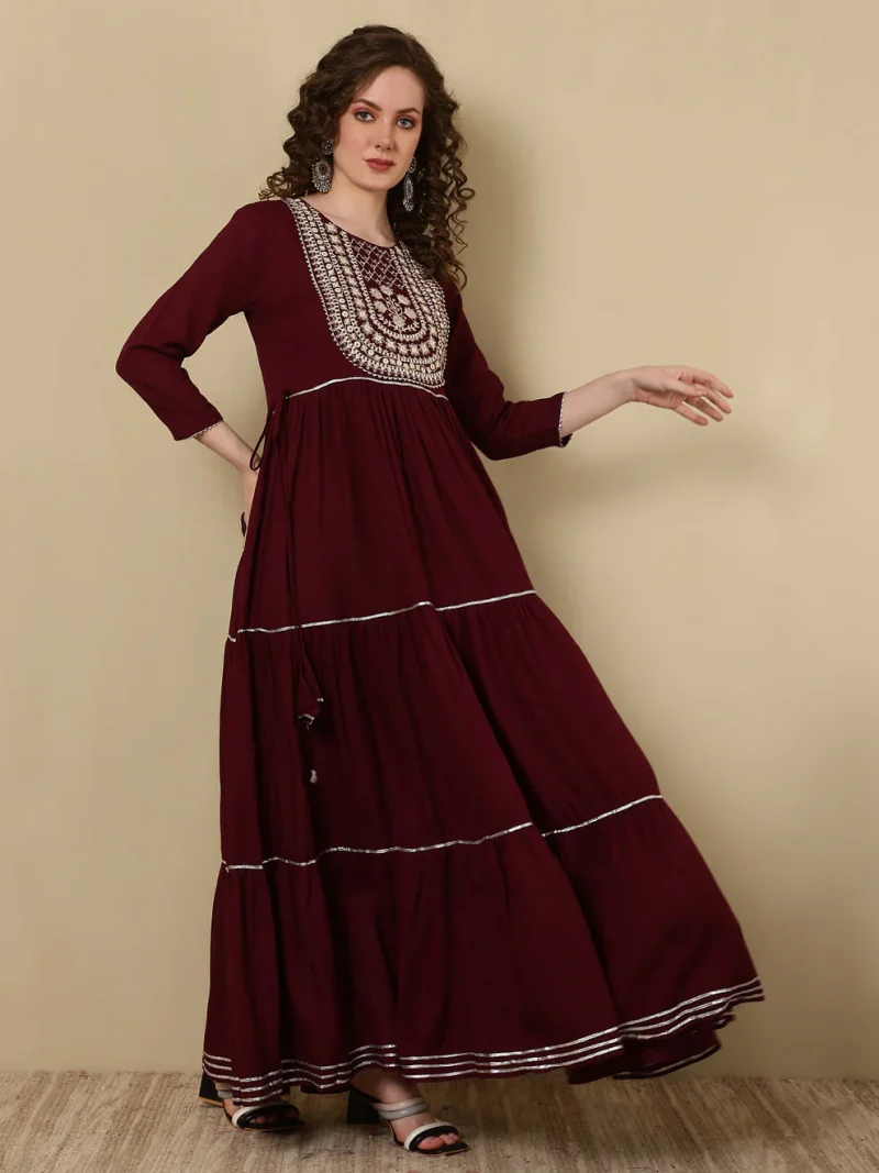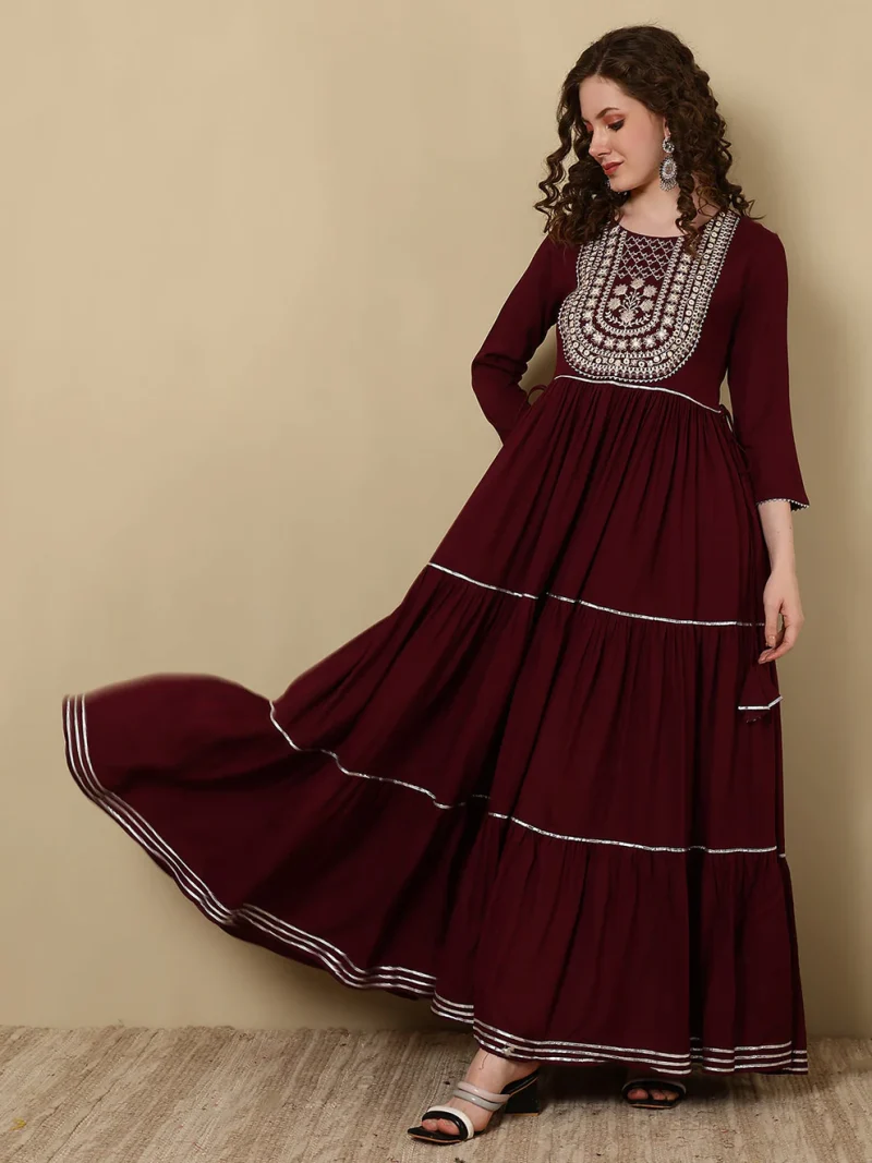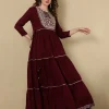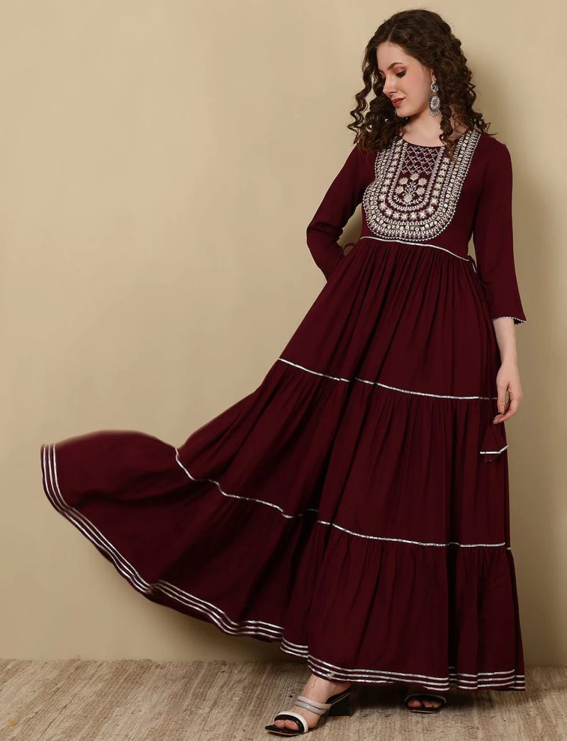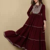 Embroidered Ankle Length Round Neck Tiered Kurta