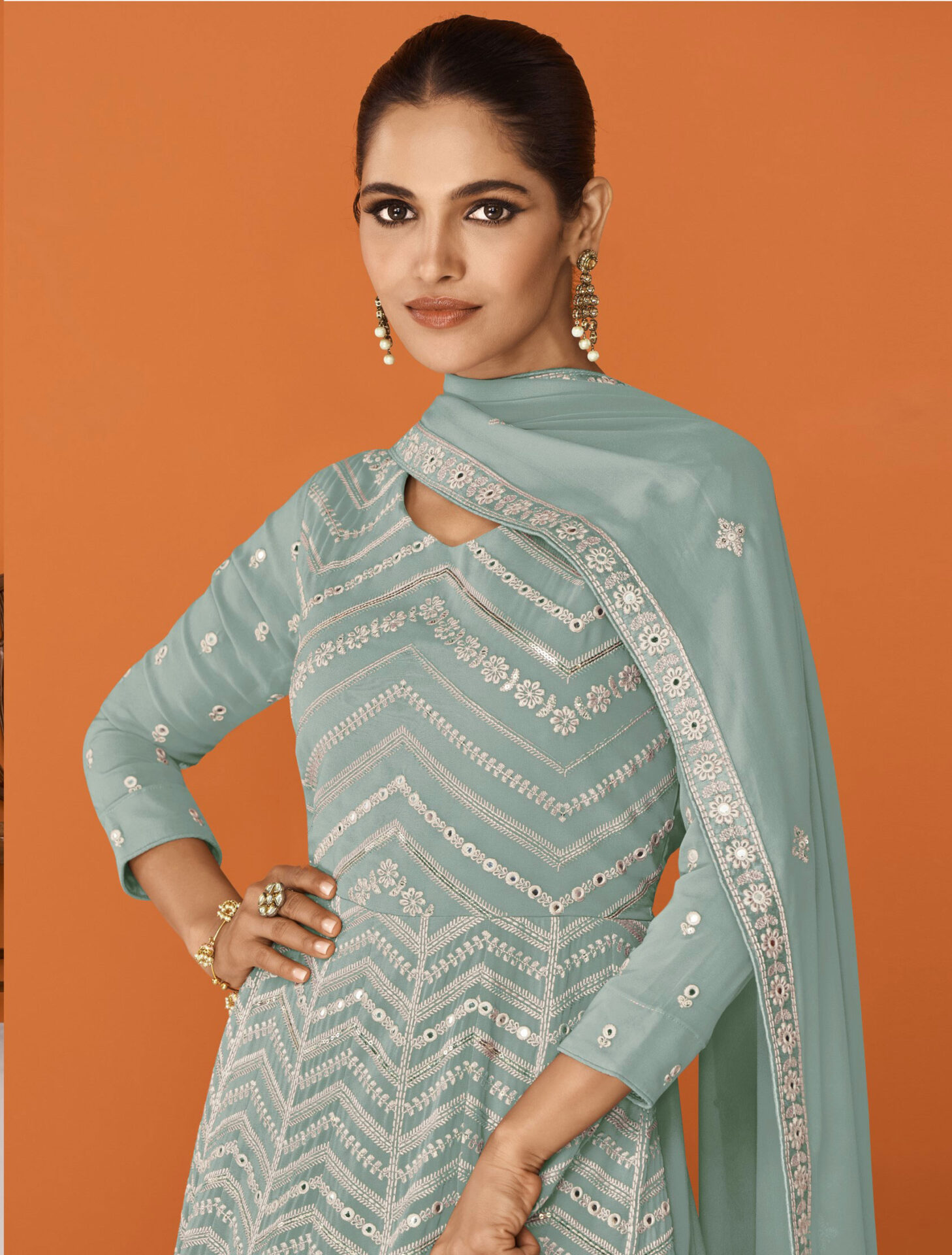 - The light blue color of the georgette anarkali suit exudes understated elegance and sophistication.