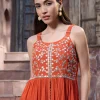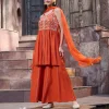 Drape yourself in sophistication with this Saffron Orange Embroidered Sharara Set crafted from premium Viscose Rayon.