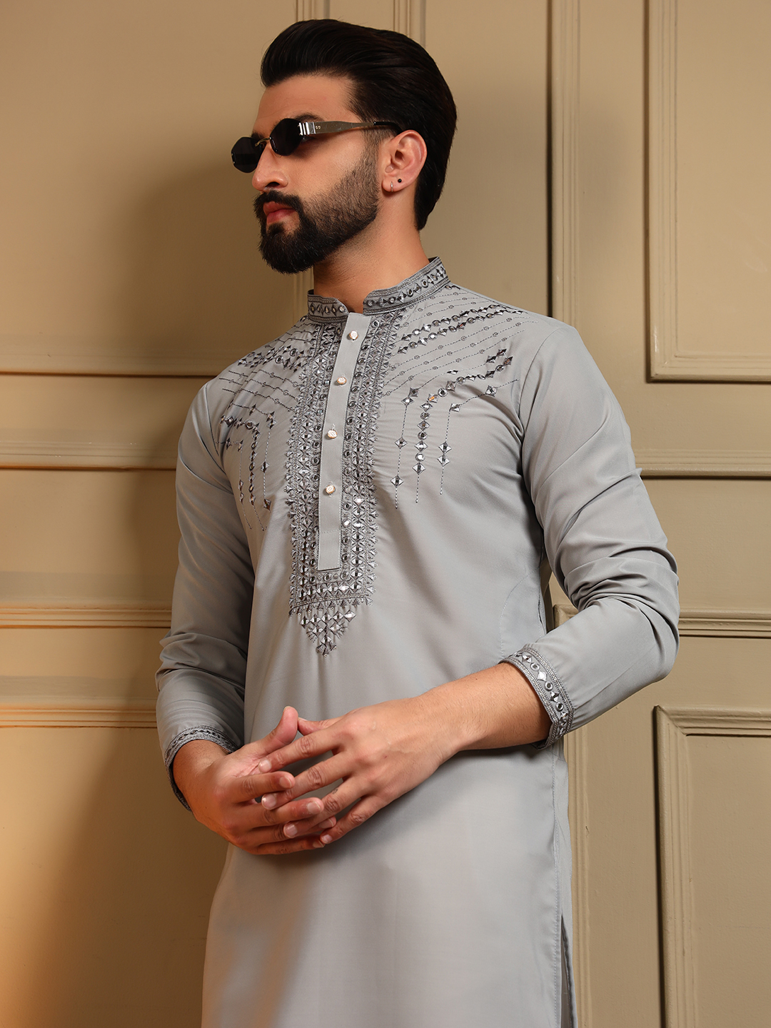 Thoughtful styling enhances the regal charm of this kurta pajama. Simple accessories create a balanced and sophisticated look.