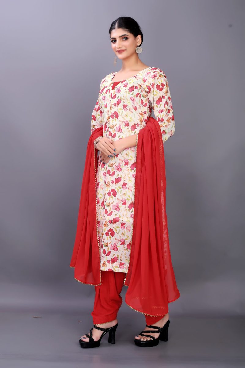 Crafted from premium georgette fabric, this salwar suit features a soft and breathable texture. The delicate floral print adds freshness and vibrancy. Available in a variety of pastel and rich tones, each design highlights intricate detailing. The semi-sheer georgette material ensures both comfort and sophistication, making it suitable for warm and cool seasons alike.