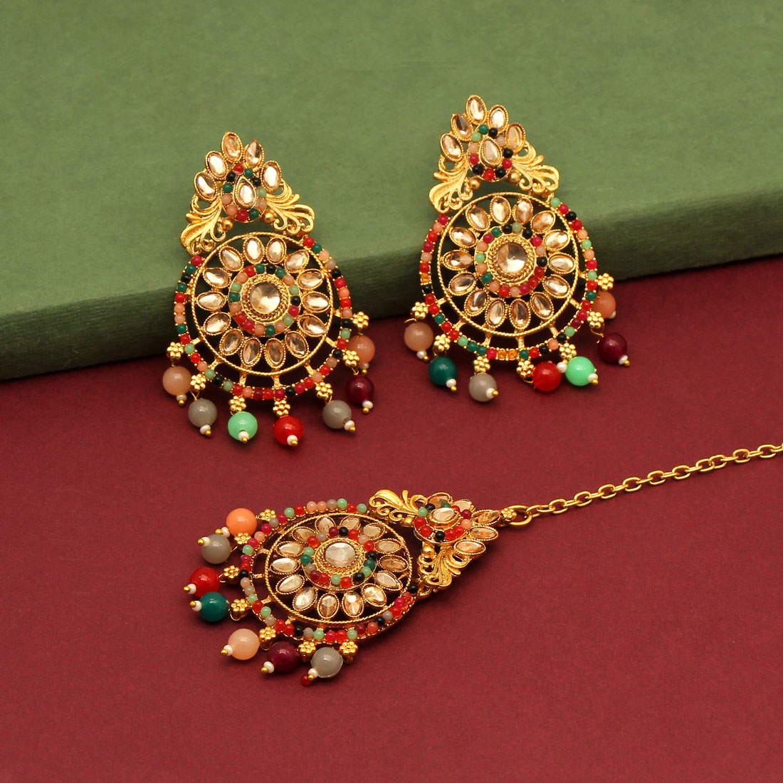 Golden muticolour Earrings and Maangtikka