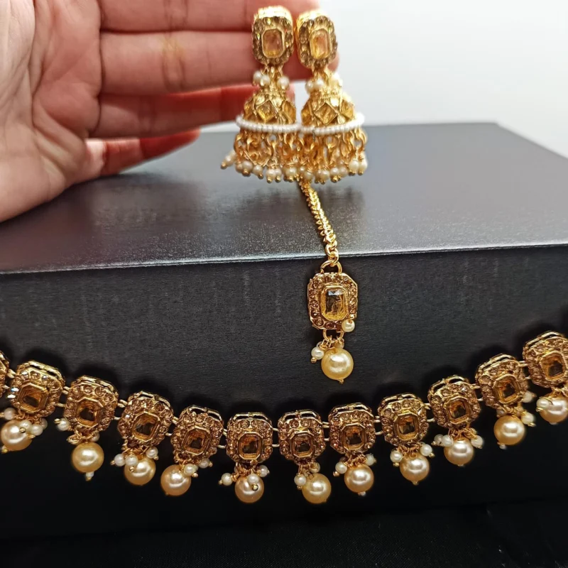 Golden Tone Necklace with earrings and maangtikkaAvailability: 2 In Stock