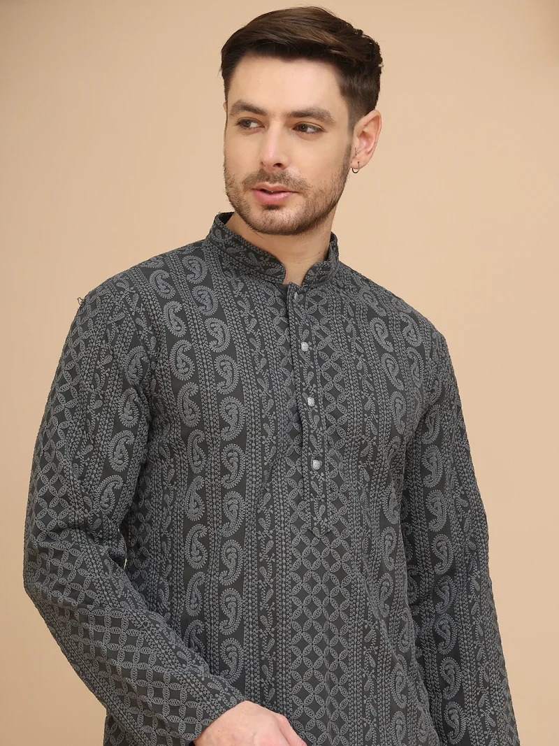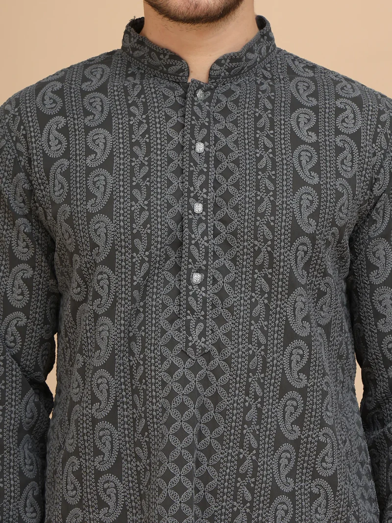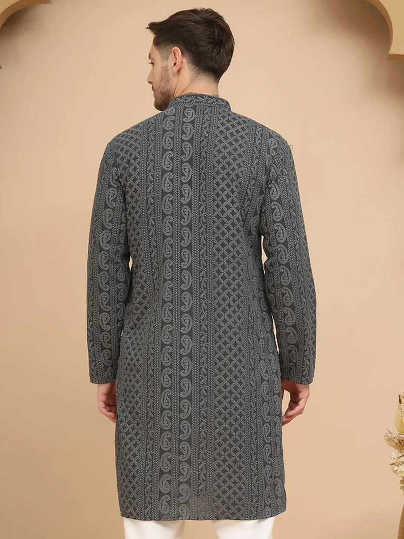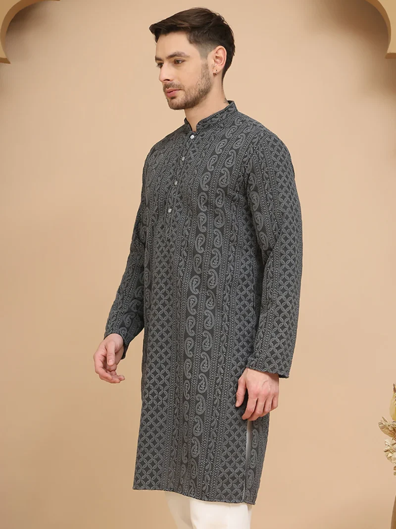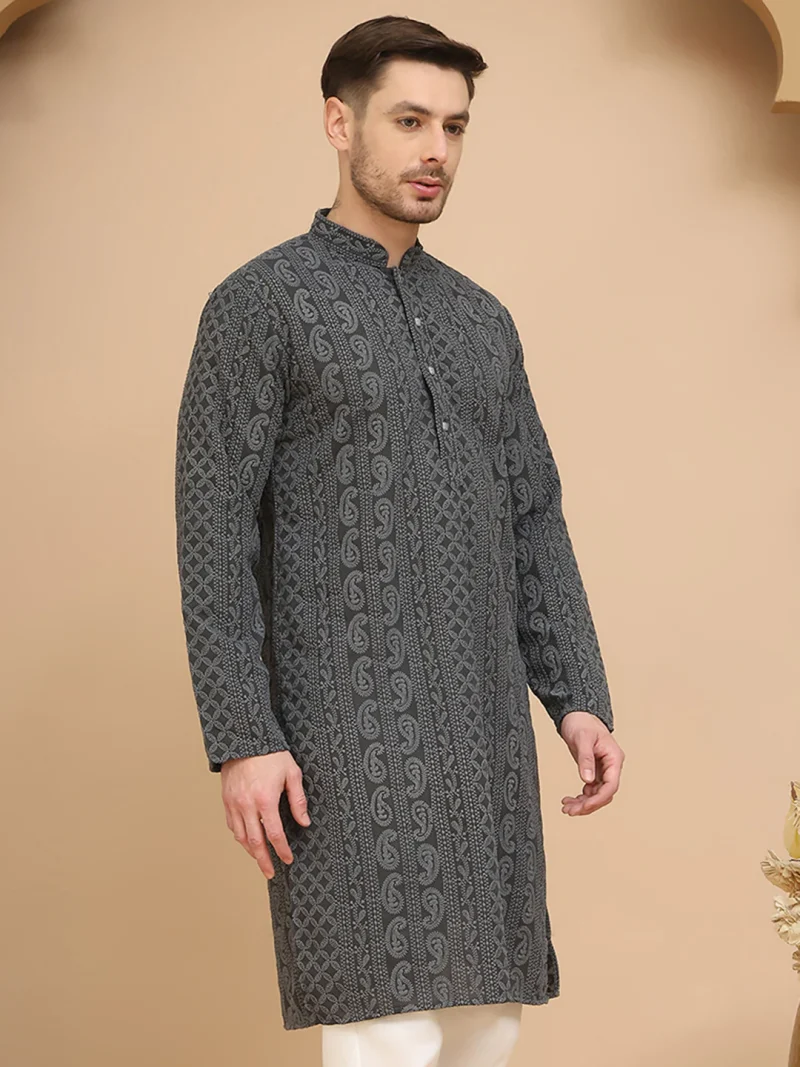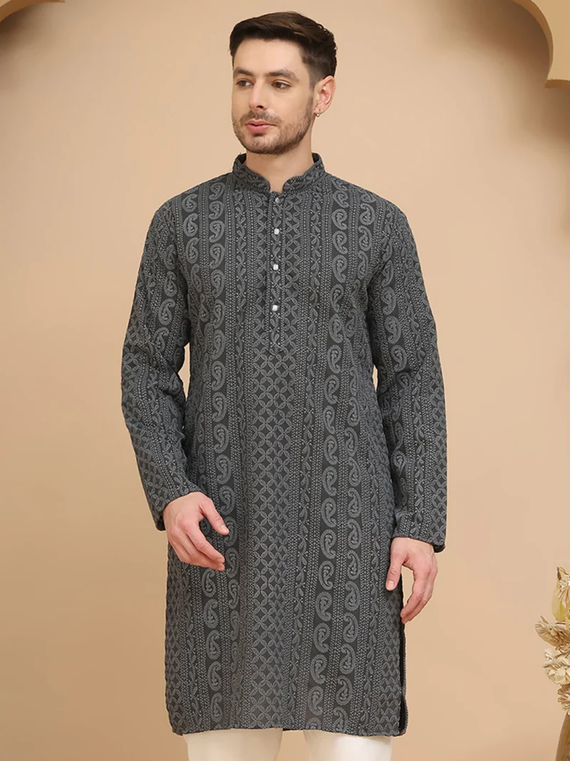 This Grey Chikankari Embroidered Kurta for men offers refined detail and everyday comfort.