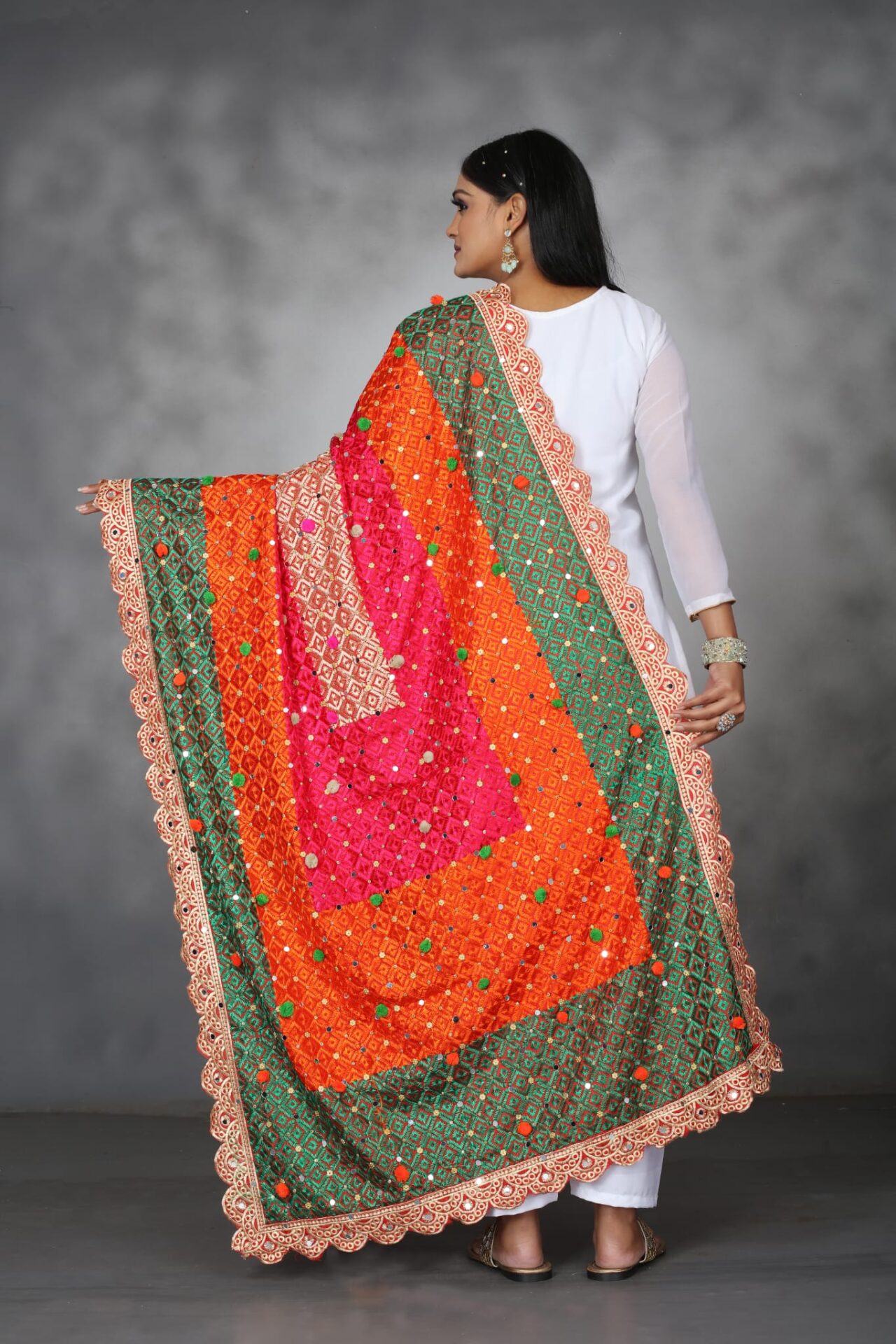 - Experiment with different draping styles to showcase the intricate embroidery and vibrant colors of the Indian Multi Colour Phulkari dupatta.