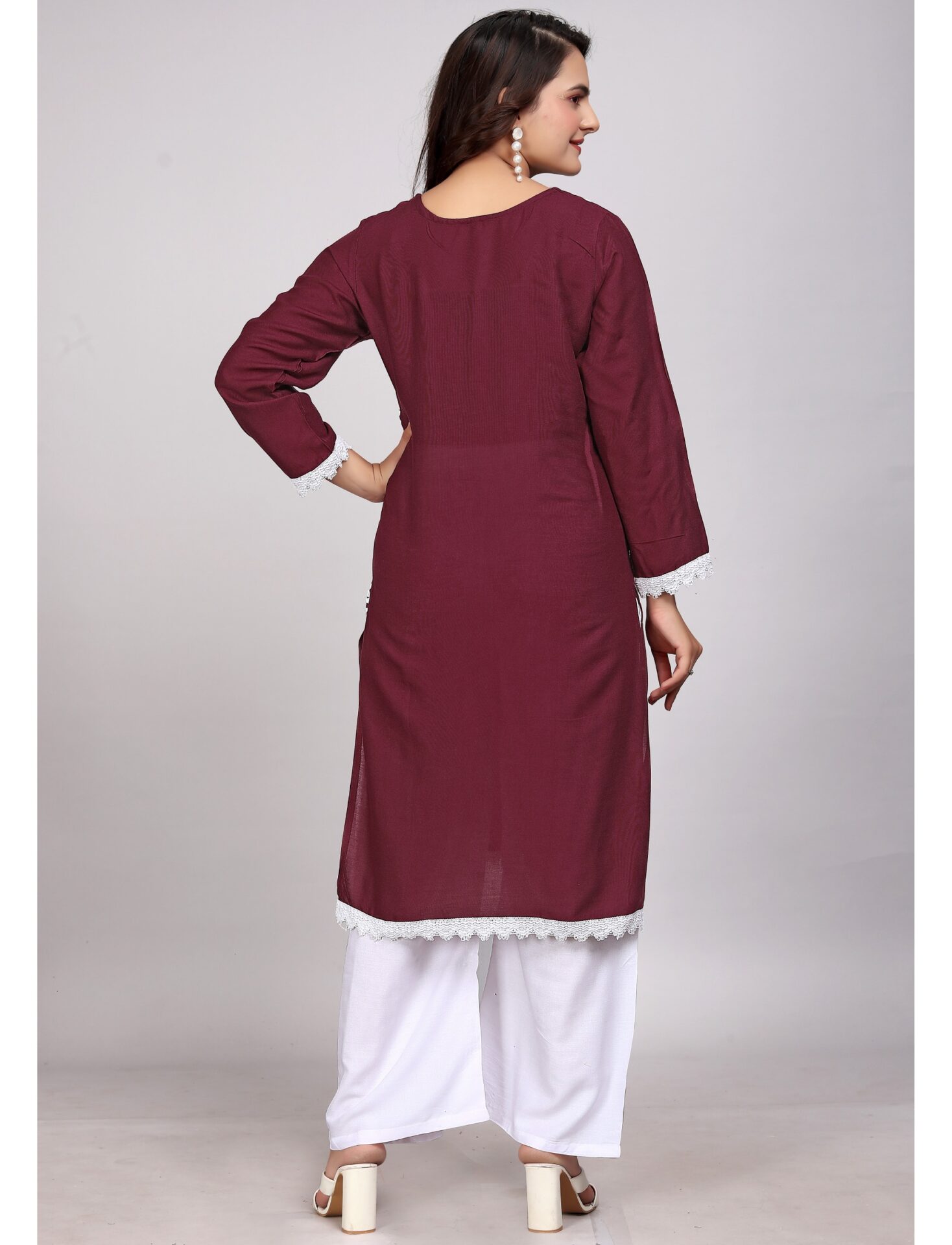 To complete your look, pair the Lucknowi Maroon Rayon Kurti Set with traditional gold or oxidized jewelry. Statement