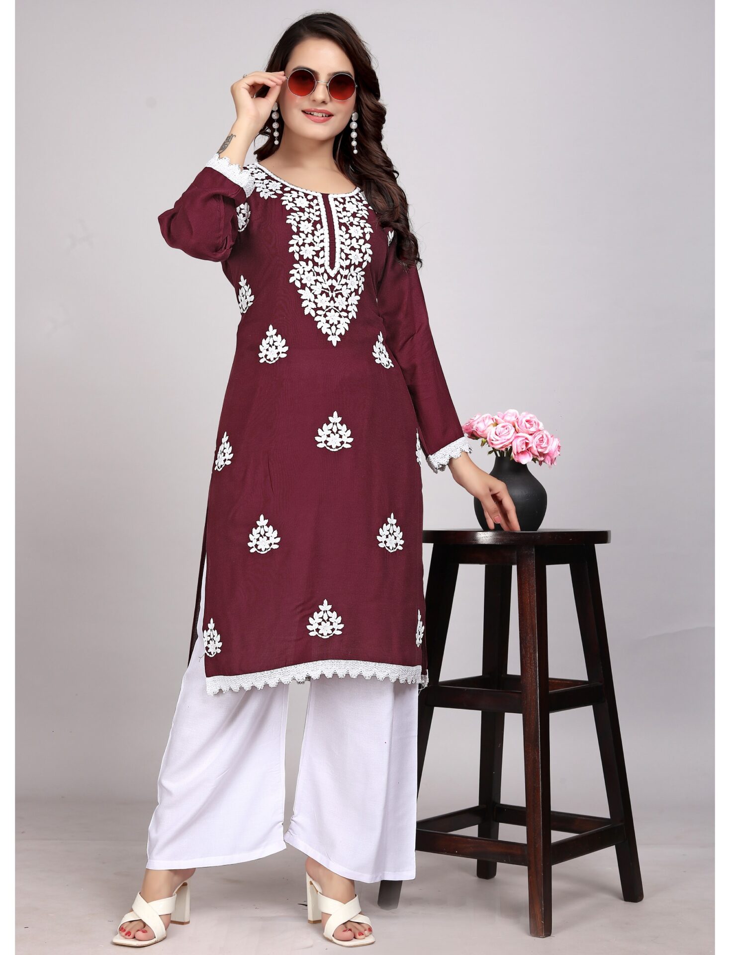 The Lucknowi Maroon Rayon Kurti Set is more than just an outfit; it's a celebration of tradition, craftsmanship, and style. Embrace this stunning attire and make a statement at your next occasion.