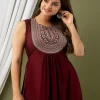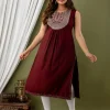 Stay cool and chic under the summer sun. The airy rayon fabric makes this kurti ideal for hot days. Its sleeveless cut ensures breathability, while the maroon hue adds a bold splash of color. Whether you’re attending a brunch, shopping, or enjoying a coastal getaway, this kurti keeps you stylish without compromising comfort.