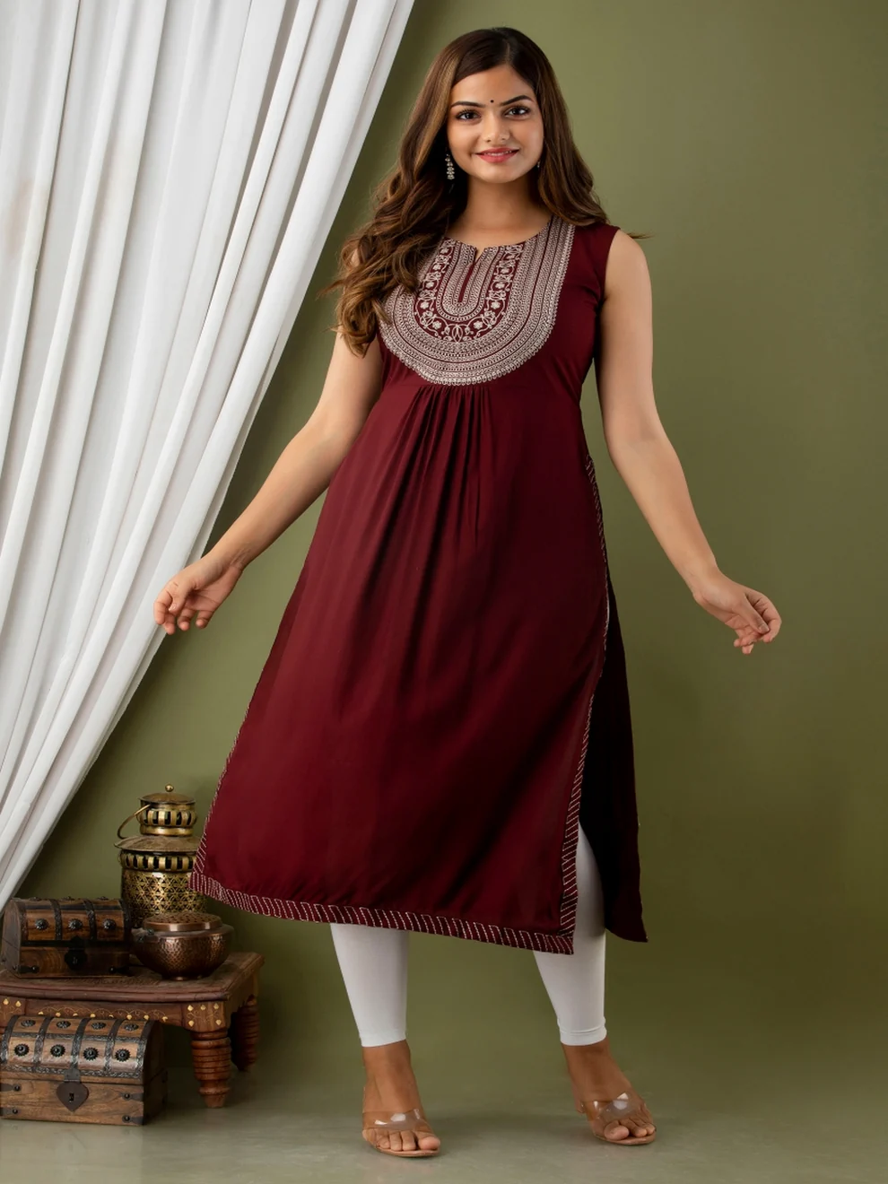Maroon Embroidered Straight Kurti – A Perfect Blend of Tradition and Modern Grace