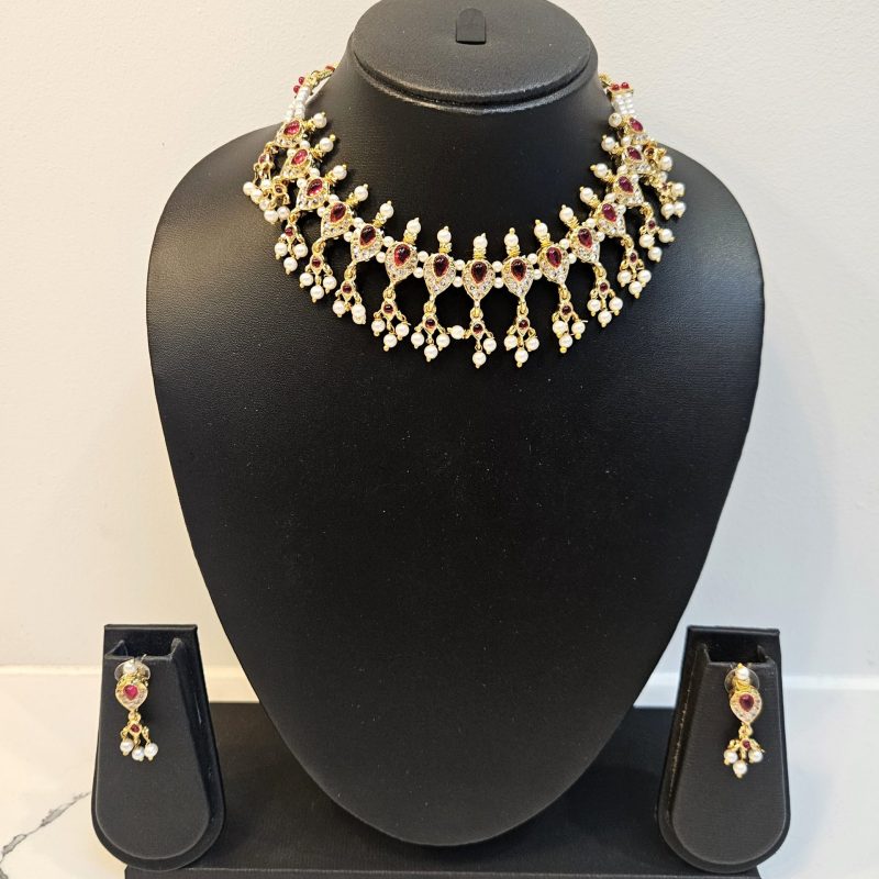 Maroon represents strength, passion, and royal heritage. White pearls symbolise purity, wisdom, and grace. Together, they reflect balanced beauty and emotional harmony. Traditionally, such combinations enhance ceremonial and festive attire. Moreover, pearls remain timeless across generations. Meanwhile, maroon stones add cultural depth and richness. Therefore, this necklace celebrates tradition with modern elegance.