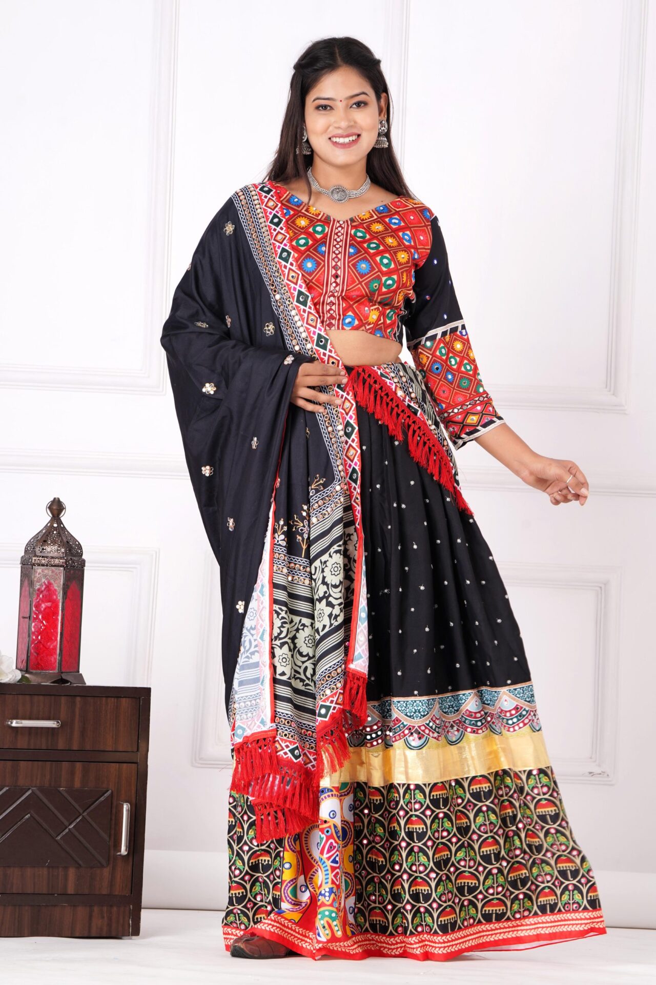 Product Description: Red and Black Navratri Mirror Chaniya Choli for Garba
