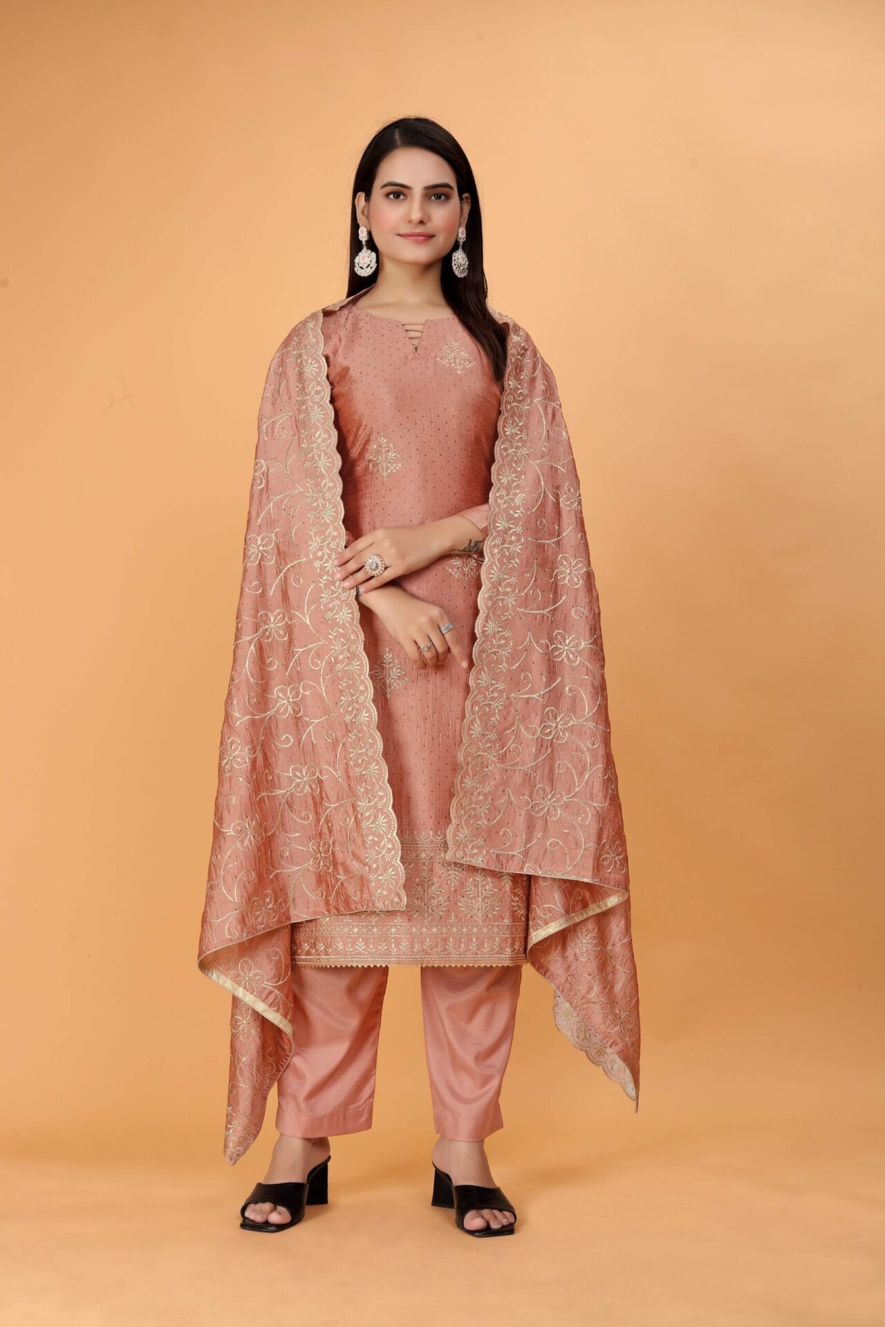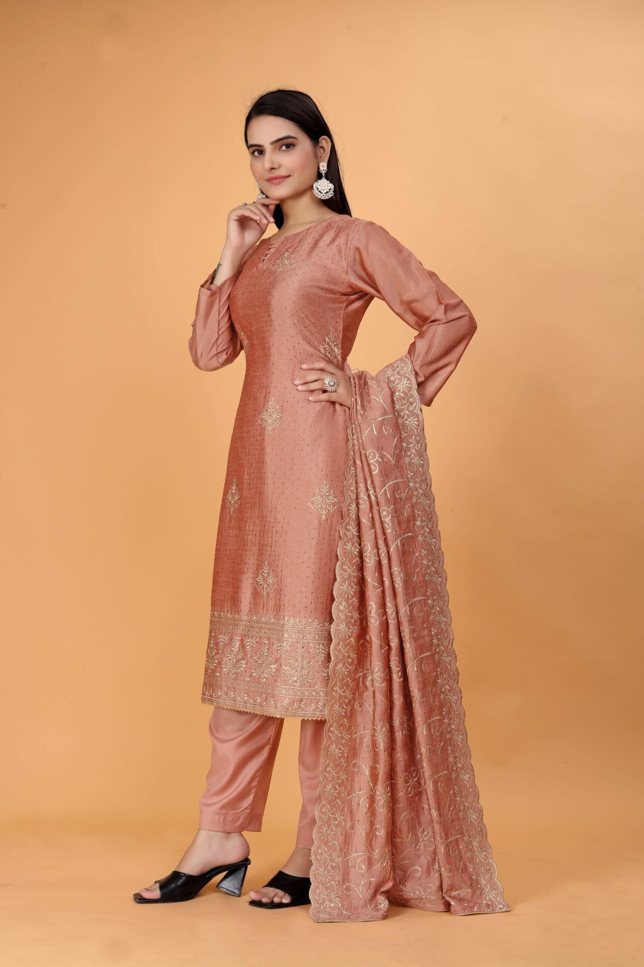 In the vibrant tapestry of Indian fashion, the Peach Punjabi Salwar Suit Traditional stands out as an epitome of grace and tradition. Its intricate embroidery work, especially in Blush Pink and Copper colors, has made it the perfect outfit for celebrations like Eid, Diwali, Dussehra, Durgapuja, and weddings. This timeless ensemble, crafted from silk and adorned with exquisite embroidery, not only enhances a woman’s appearance but also reflects the rich cultural heritage of India.