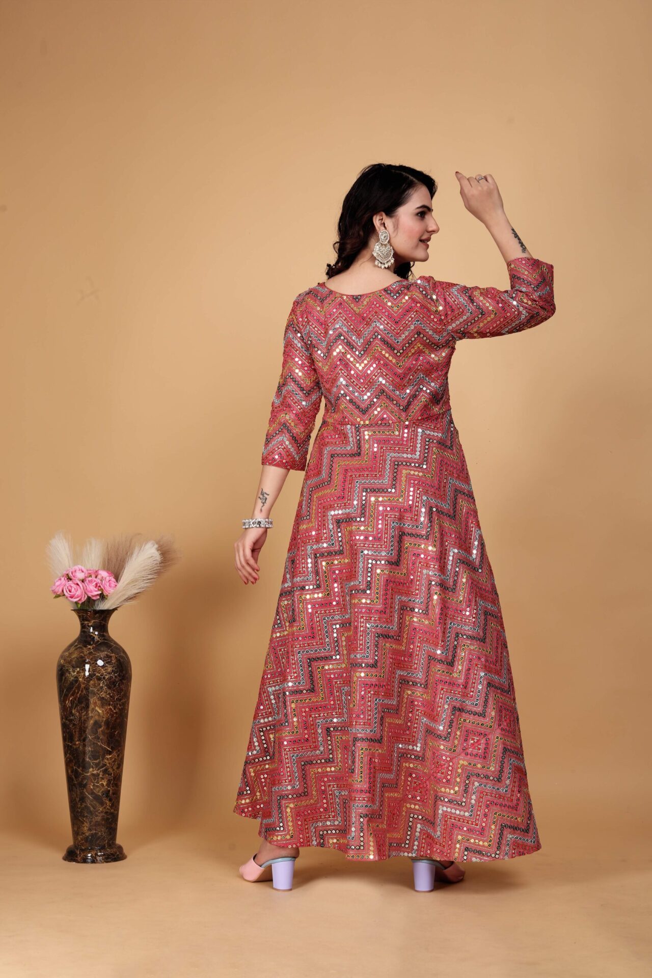 Anarkali gowns, particularly those adorned with heavy sequins work on georgette fabric, exude opulence and grandeur. The intricate embroidery, coupled with the shimmering sequins, creates a mesmerizing effect, perfect for festive celebrations.