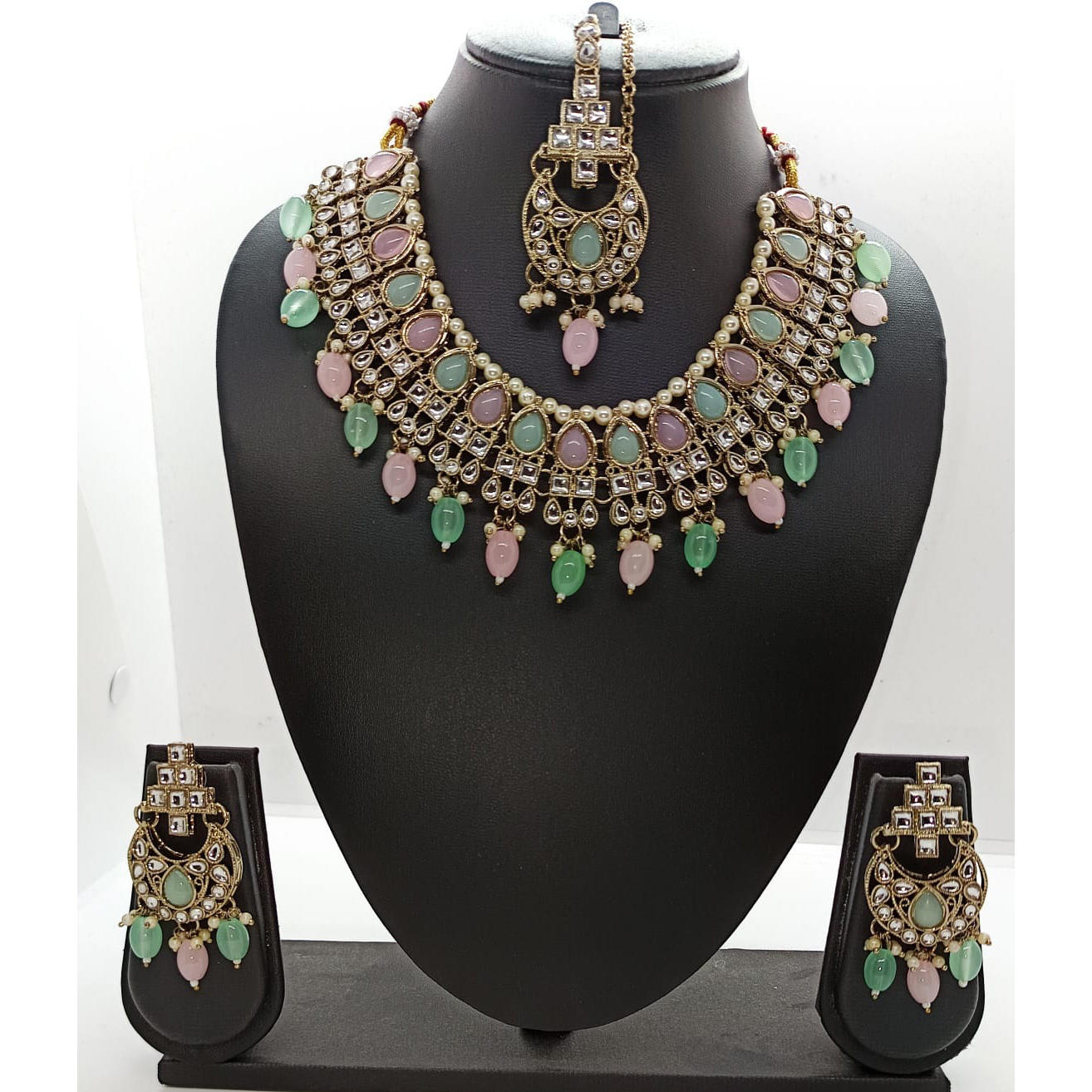 Pink Green Kundan Necklace with Earrings and MaangTikkaAvailability: In Stock