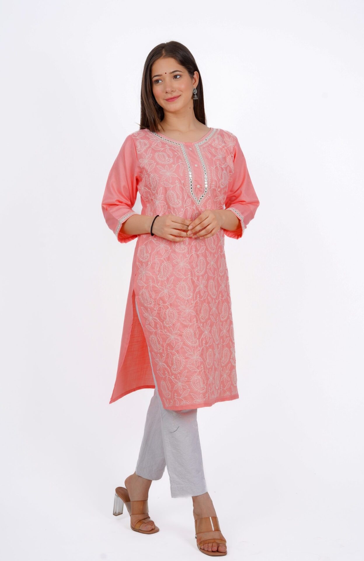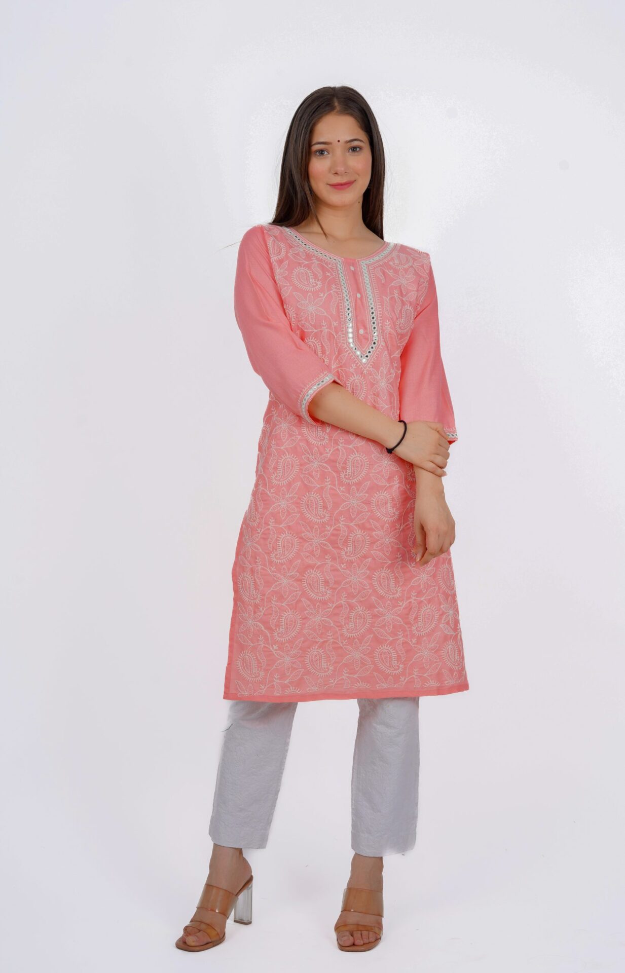While pink Lucknowi kurtis capture attention, clever color pairings can accentuate your traditional style. Contrast the soft pink with brilliant greens, yellows or blues on the dupatta or bottom wear. Furthermore, Go for monochromes by teaming the kurti with lighter pink leggings or white churidars.