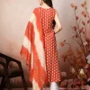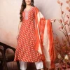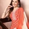 The viscose rayon fabric feels gentle and breathable on the skin. Moreover, the A-line shape creates a graceful fall that suits every body type. The printed design adds cheerful color, while the embroidery brings subtle shine. The flared hemline moves beautifully with each step, and the matching dupatta completes the look with balance.