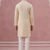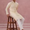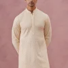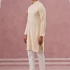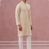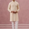 This rayon embroidered kurta pyjama offers smooth texture and lightweight comfort. The beige tone adds understated sophistication. Furthermore, the mandarin collar creates a sharp, structured look. Fine embroidery enhances the kurta without overpowering the design. The knee-length cut ensures comfort and effortless movement. In addition, rayon fabric feels breathable and soft on the skin.