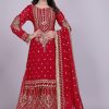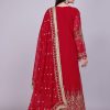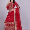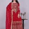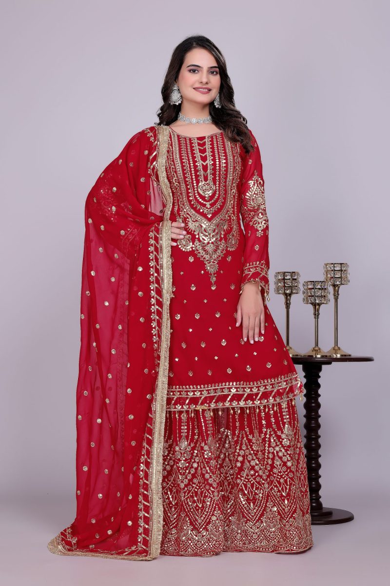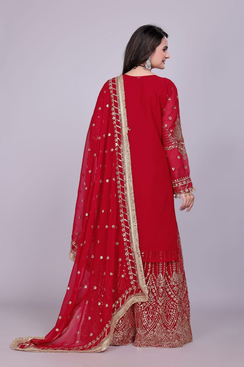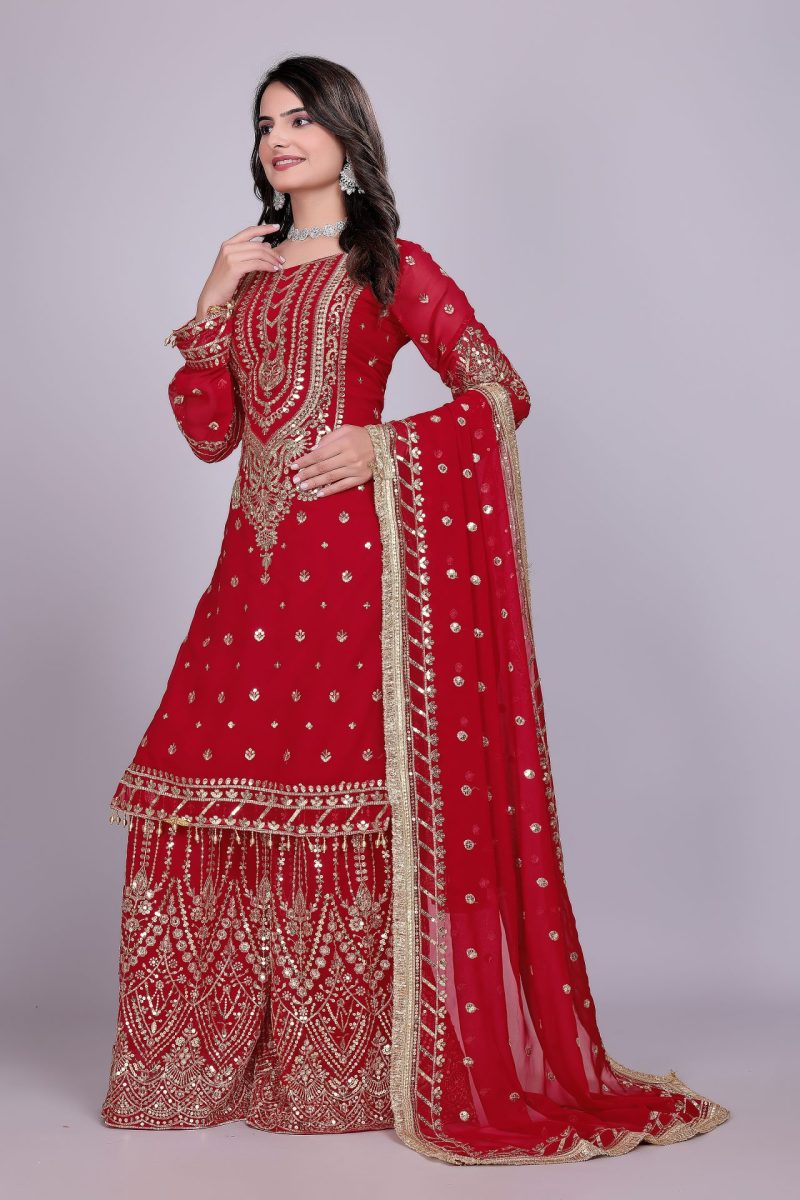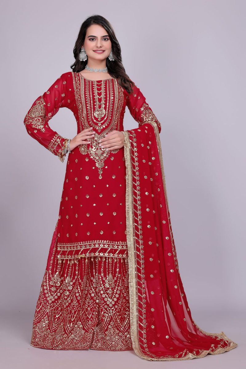 Crafted in a striking red shade, the suit features detailed embroidery that enhances its festive appeal. The breathable georgette fabric ensures comfort, while the palazzo cut provides ease of movement. Together, these elements make it both luxurious and versatile.