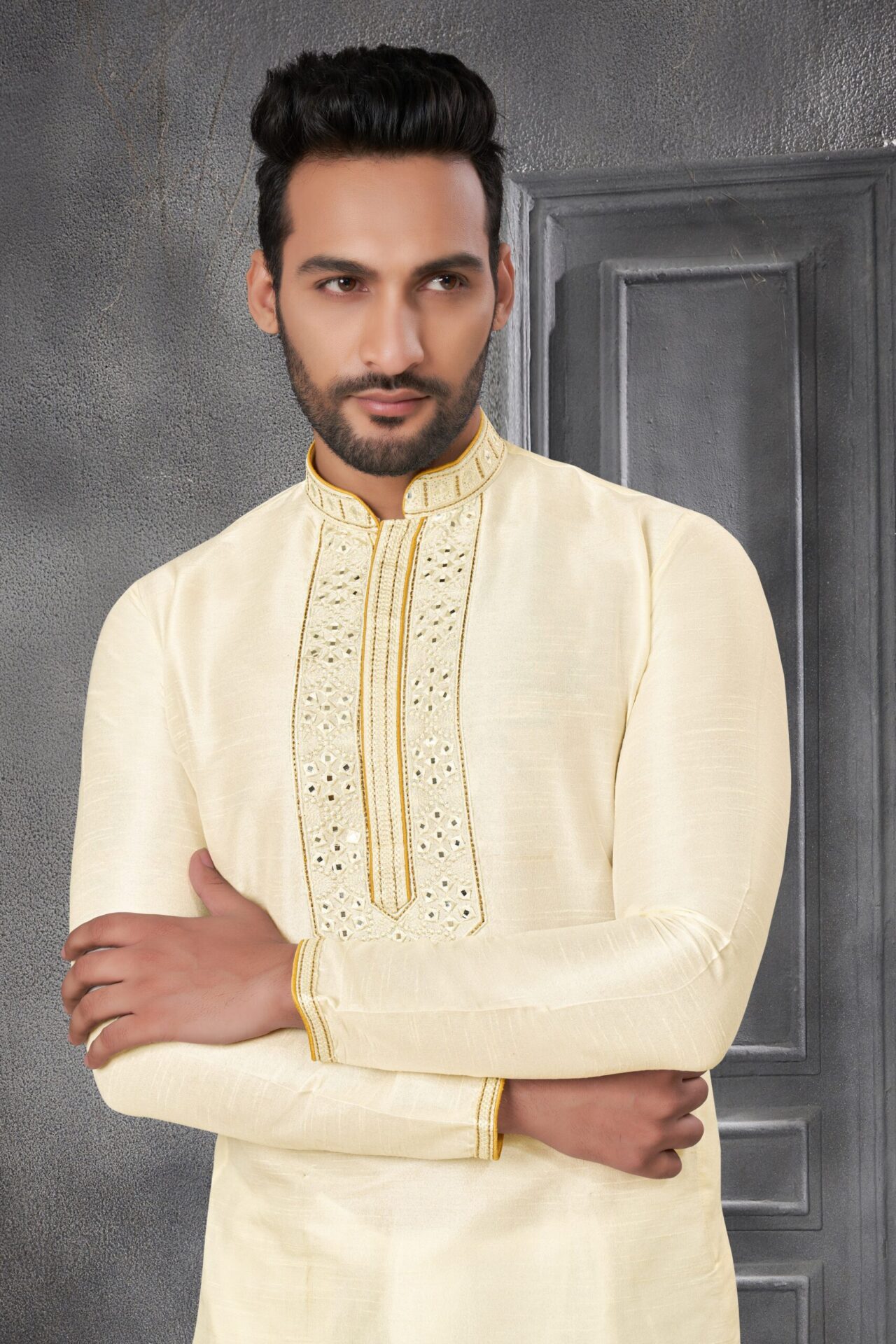 B. Parchment in Color: A Mark of Elegance The choice of parchment color in the embroidered silk kurta, coupled with a white semi-cotton pajama, adds a touch of sophistication to men's attire. The subtle hues speak volumes about the wearer's taste and style.